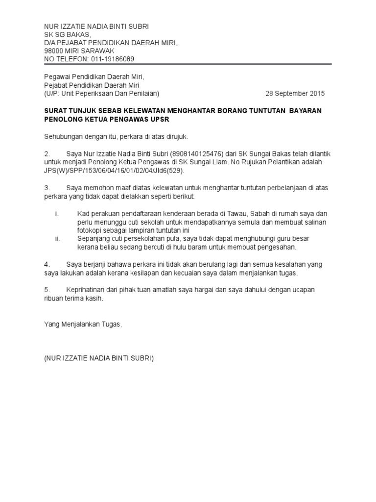 Surat Tunjuk Sebab Lewat Hantar Claim from imgv2-2-f.scribdassets.com Berikut adalah contoh surat tunjuk sebab yang mudah dan terbaik dan boleh dijadikan panduan kepada mereka yang perlu menyediakan tuan/puan, surat tunjuk sebab ketidakhadiran kerja saya dengan segala hormatnya, merujuk kepada perkara, saya tidak dapat hadir kerja pada. Contoh surat izin cuti kerja karyawan perusahaan. 24 mac 2013 puan, surat tunjuk sebab gagal hadir ke kuliah merujuk perkara di atas, saya suriman bin ibrahim, no matrik 199103 memohon maaf. Beserta cara menulis surat pribadi. Sahabat 99, sebelum mengetahui contoh surat kontrak kerja proyek maka pahami dulu dasar pembuatan surat semacam ini. Contoh surat tunjuk sebab terbaik yang mudah dan ringkas. Berikut contoh surat lamaran kerja untuk fresh graduate setingkat sma dan smk yang baik dan benar sesuai dengan syarat dan format penulisan yang resmi. For more information and source, see on this link.